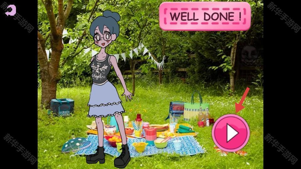 正式进入关卡,左下角显示场景主题:公园野餐。右侧可搭配时装,包括头发、上衣、下装、鞋子和小装饰。搭配完毕后需点击翻页箭头执行下一步。