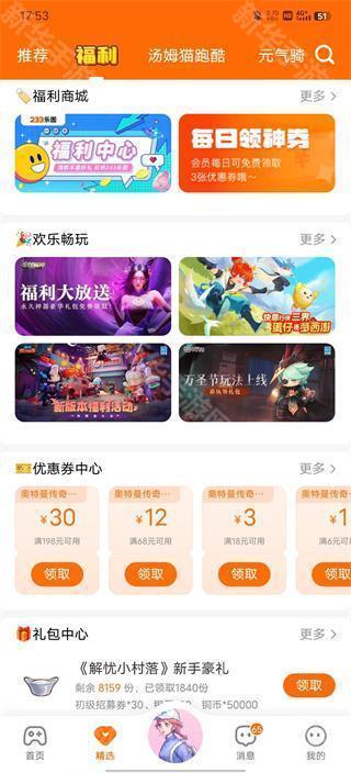 5、在【福利】专区能够获取游戏道具、折扣券等福利,大家可以去看看领对应游戏的礼包哦。
