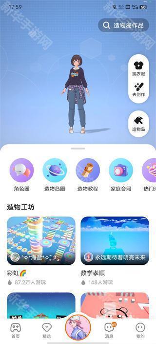 6、233乐园APP内还有造物岛功能,是自带的沙盒游戏,在其中可以实现角色捏脸、换装、地图创作等等操作,创造自由度超高,,可以和你的小伙伴一起玩哦,不用担心上手难,造物教程也为您贴心奉上。
