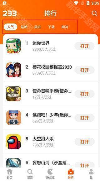 排行榜主要分为人气、最新、飙升、下载和期待榜,可以轻松找到近期热门游戏,或者预约即将上线的新游戏。