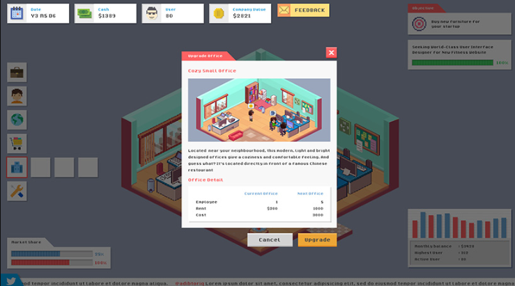 2、完全不同的任务,能够解锁各种办公楼写字楼的内容,提升公司总部的等级自由选择出租或是出售。