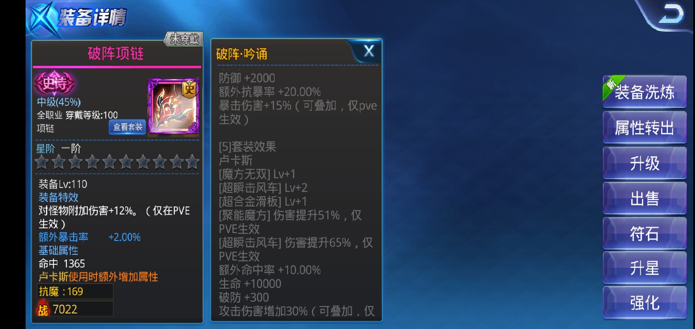 目前主流装备破阵套(有部分大佬因为曾经的炎龙装备洗练较完善所以竞技用了炎龙装备)出处关辉之城时空深渊本(等级100、25万战力、500抗魔准入),10气息六体力一次,一天30次。出的装备包括(破阵 龙胆 七星)龙胆七星没有套装效果,如图