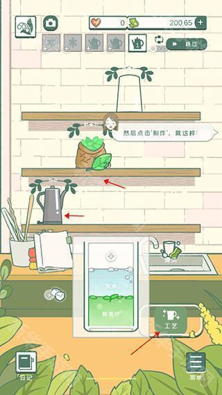 3、按照需求制作饮品获得的金币就会更多,以“绿茶”为例,先点击货架上的茶叶、然后点击热水,最后点击工艺就可以完成制作。