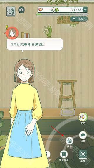 7、不断制作新的饮品满足客人的更多需求,当然也需要新的食材才能够完成,点击右下角的菜单,找到“商店”。