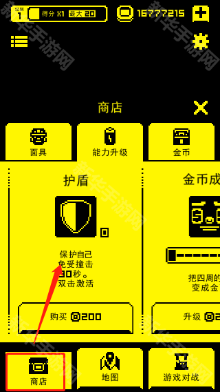 在商店中,我们可购买游戏道具,例如“护盾”可保护直接免受撞击30s,在游戏内双击即可激活