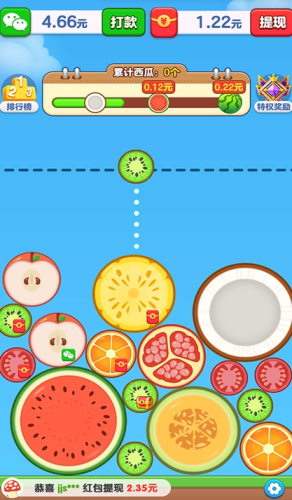 我的奖励在3元左右。开局的时候留意一点,放准一点,可以轻松合出大西瓜的。