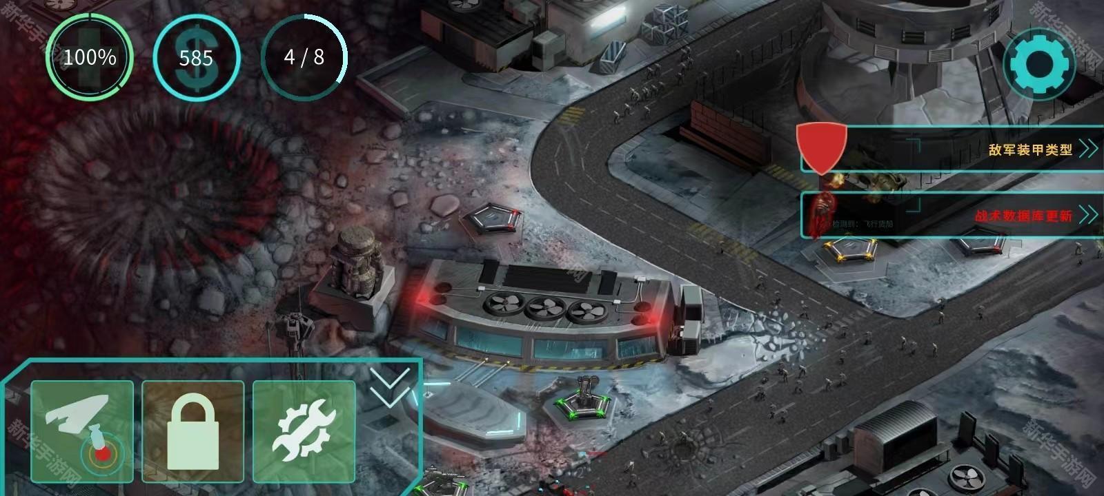 8、支持能力菜单位于屏幕左下角,但是每一个都需要时间来充电,这就需要玩家的策略能力了,点击左下角第一个图标可以发动空袭;