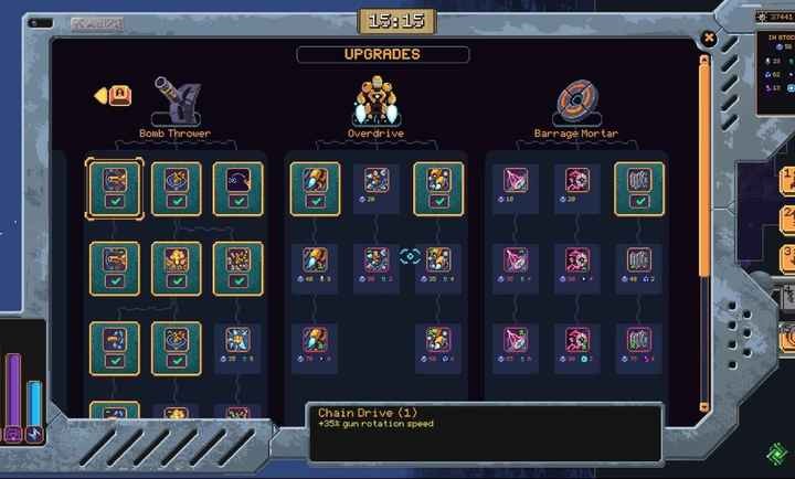 这里说说局外升级项目,蜘蛛移速是必点的升级项目,不升级移速连第一波的boss战的攻击都躲不掉,而且操作笨重,要想不被基本无伤通过boss战,至少得升级到2级引擎;要想打boss快,火箭发射器也建议点到2级;背包容量只能说越大越好,升到满级可以大幅提高资源搬运效率,正三负三层的矿洞都不小,反复跑很浪费时间;蜘蛛血量点1级即可;钻头看起来没什么用,实际上在你熟悉洞穴地形后可以帮助快速判断地形,同时和后面的鱼雷挖掘装置配合采矿效率大幅提高,但前期没什么太大作用,点1~2级即可;向上和向下跳跃只需点1级即可,能用到的时候不是很多。