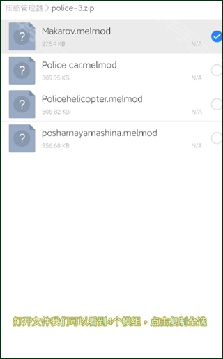 1、在第三方渠道下载好的模组,将文件使用“ES浏览器”打开,然后复制全部模组
