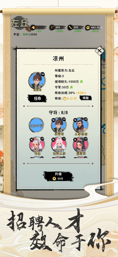 当有多个城的时候,我会频繁的更换治所,保证每一个政令都用来招人了。(这时候记过不怕,让他记几次,升官都都没了。而且还能看广告免记过)