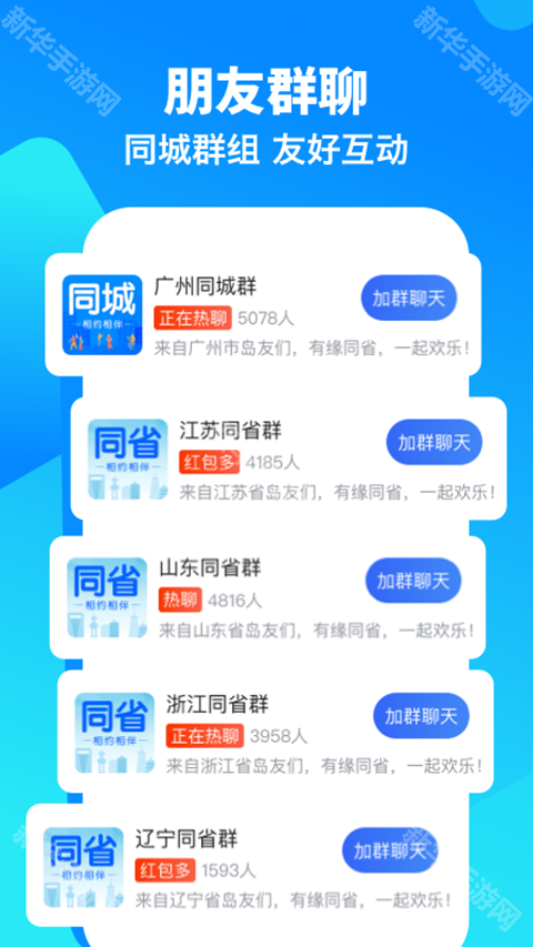 《闲趣岛中老年交友》这款软件里面拥有众多的兴趣群组,这款软件是一款专为中老年交友打造,涵盖读书分享、文化艺术等多个领域。用户可以自由加入感兴趣的群组,与志同道合的伙伴们展开深入的交流和讨论,分享经验和见解,共同成长和进步。这种基于兴趣的群组交流方式,不仅满足了用户多样化的社交需求,还能够促进用户形成更加紧密的社交圈子,非常好用又有趣的交友平台,快来下载闲趣岛吧!