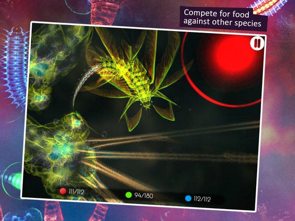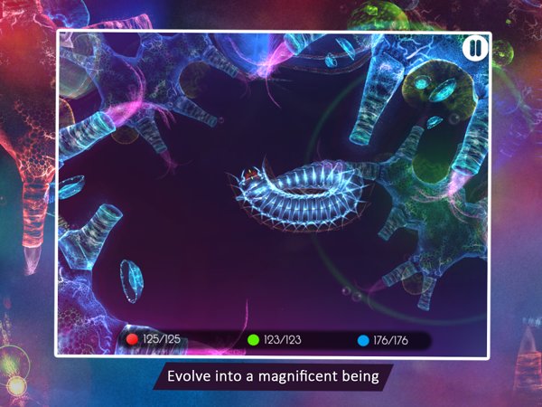 【光影穿梭2进化】这是一款休闲闯关类型的游戏,游戏由“Forever Entertainment”工作室制作,游戏玩法类似“孢子”,玩家扮演在微观世界中的一个神奇的细胞,你需要不断的吞噬其他比你小的细胞来不断的成长,进化成更高级的生物,从一开始一无所有,到变身成为有眼睛,可以喷毒或者有有爪子、尖刺的细胞,提升自己的攻击力,消灭其他的生物来成为这个微观世界的王者。