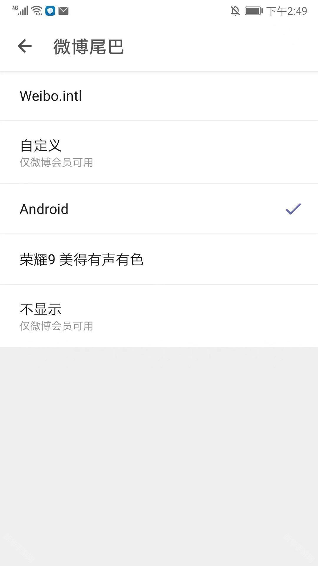 4、进入微博尾巴界面,我们可以选择系统默认的微博尾巴也可以自定义微博尾巴。