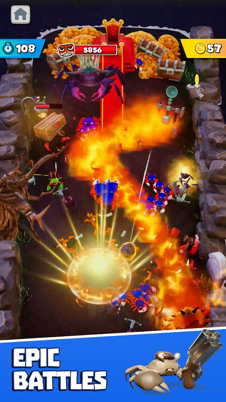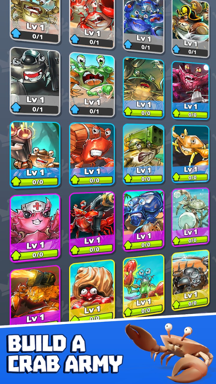 1、玩家可以通过积累能量召唤螃蟹大军,随着游戏的推进,螃蟹的种类会越来越多。