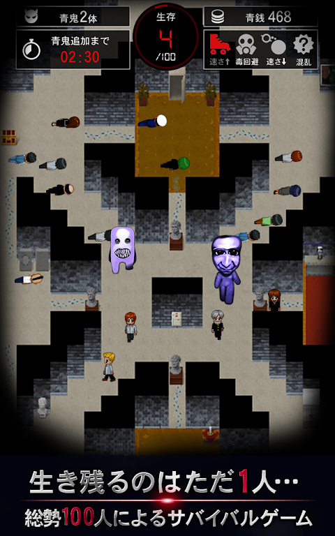 100名参与者和青鬼在线生成(其中100名也包括NPC),玩家控制100人当中的其中一个,逃离青鬼的追踪,直到最后一个获胜;