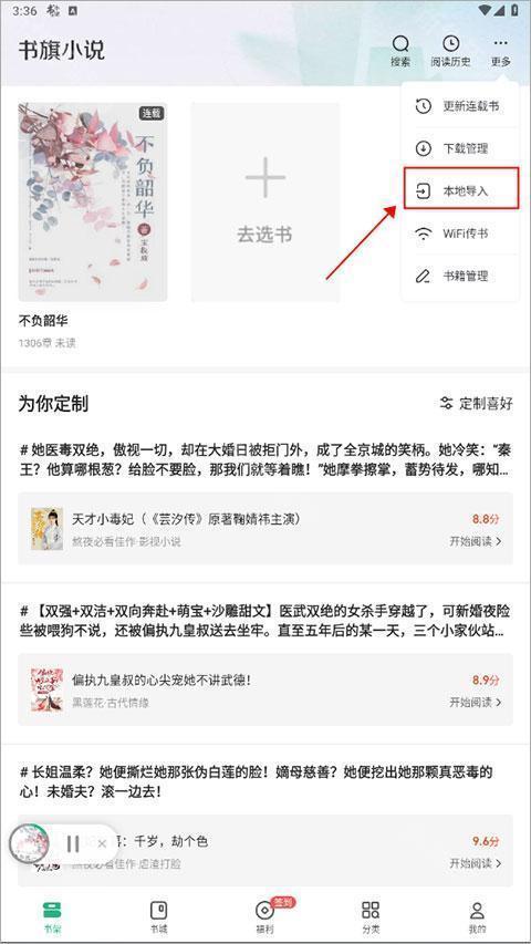 1、想到导入自己的下载的小说非常简单,只需要在首页点击右上角的“更多”,选择“本地导入”