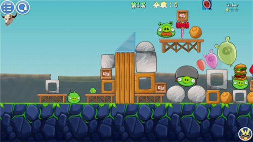 1.每只小鸟都可以预先配置它所携带的技能,如冷冻、炸弹等,消灭所有的猪。