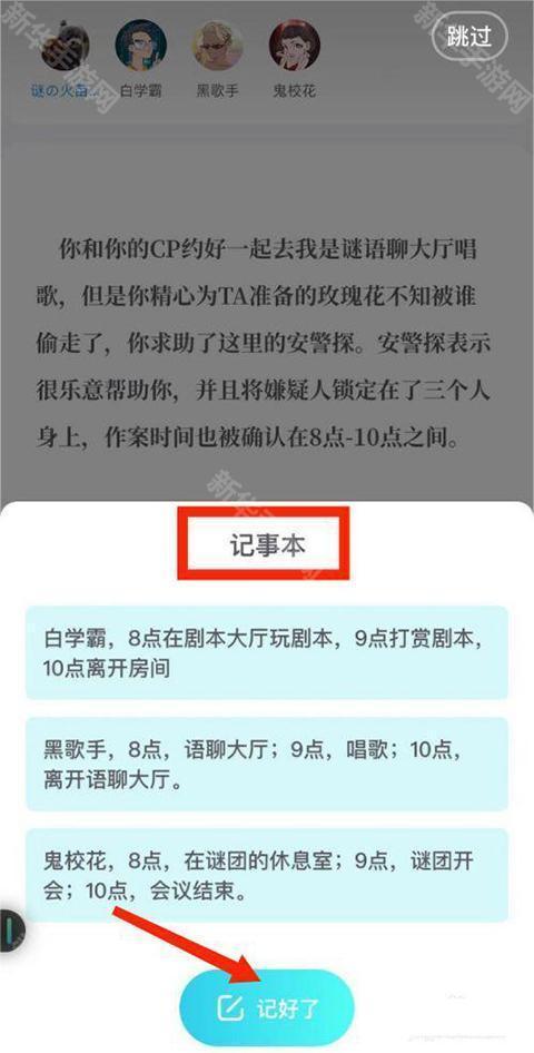 3、开始你的表演前,要认真阅读你的剧本,确认你的身份和任务。然后大家进入角色,依次进行自我介绍,当然,每个人都可能有所隐瞒,或者透漏出一些关键性信息。玩家可以使用【记事本】的功能进行简单的记录。