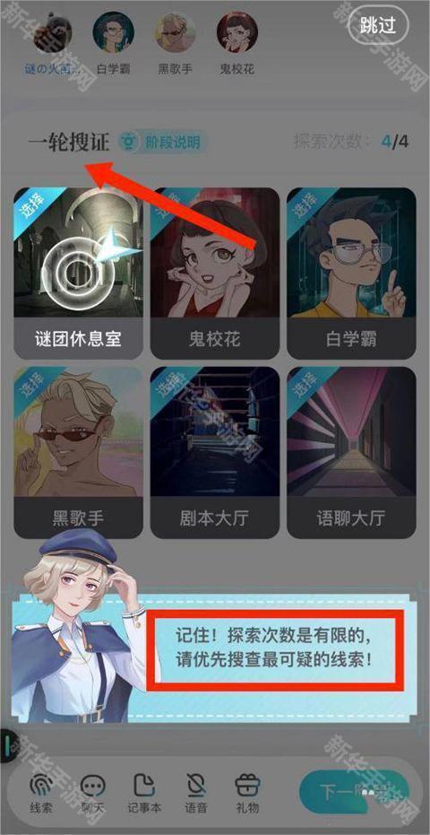 4、基本交流过后,就可以进入下一阶段的【搜证环节】了,探索次数是有限制的,需要你根据之前交流获取的信息选择你最需要探索的方向。在玩家拿到线索之后,可以选择公开,或者分享给某指定玩家,或者自己回收保留。可以在线索中看到其他玩家公开或者分享给你的线索,