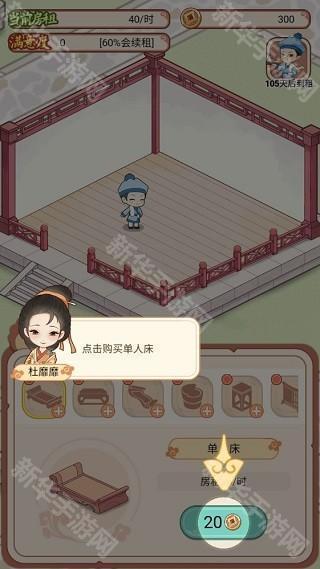 游戏的题材非常的新颖,在古代的时候收租,从最普通的房屋发展成最豪华的商业街,从一个小房子的包租婆变成大财阀,还是很有趣的,甚至可以购买更好的家具来装修,开启自己的收租生活。