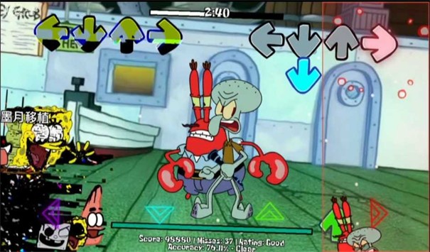 【FNF错误化海绵宝宝】这是一款音乐闯关类型的游戏,这款游戏是FNF游戏的模组之一,让玩家来到比奇堡,和被污染的海绵宝宝进行说唱对决,海绵宝宝在每次关卡中会变得更加强大,难度也会提升。错误化后的海绵宝宝、派大星、蟹老板等人气动画角色都有登,玩家需通过唱歌来阻止海绵宝宝的黑化,点击游戏中上下左右的按键,将下面的进度条移动到最右侧来获得胜利。