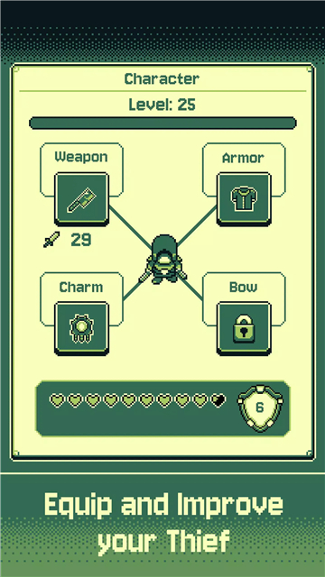 【挂机盗贼村复古rpg】这是一款挂机放置类型的游戏,这款游戏的风格相当复古,以淡绿色的游戏画面让人体验到掌机游戏机器的快感。你将扮演一个小偷,用你自己的技能偷走各种宝藏。游戏玩法非常简单,你可以自由探索每个地区寻找宝藏。有许多场景值得探索,以完成您的冒险,玩家可以解放双手,离线赚钱,非常的有趣,喜欢这款游戏的绝对不能错过,快来试试看吧。