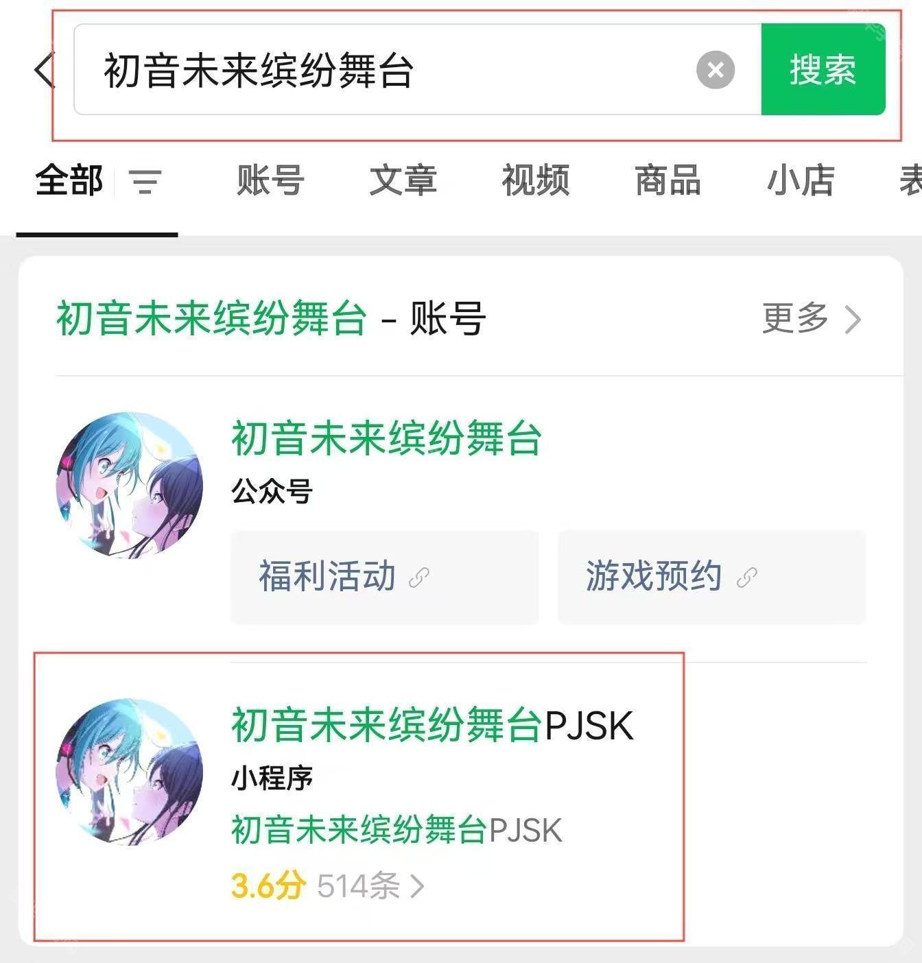 1、首先我们先在微信小程序搜索【初音未来缤纷舞台】,选择【初音未来缤纷舞台PJSK】小程序并点击进入。