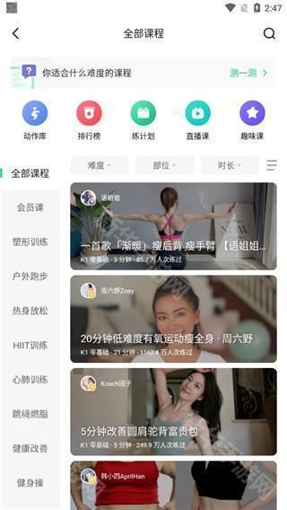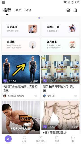 1、在app的首页里拥有多种课程、练腹肌计划、直播课以及视频可进行学习;