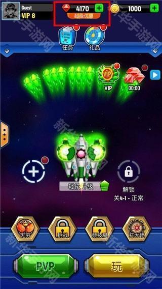 3、点开飞船界面,可以强化飞船,装配不同的装备,通过奖励和购买提升武器,更轻松消灭怪物;