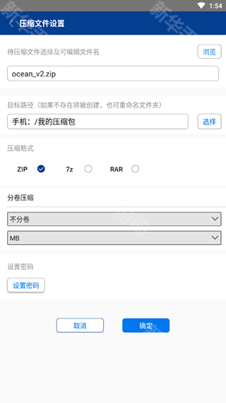 5、你可以选择压缩的格式和设置密码,设置完上述的后点击确定即可开启压缩