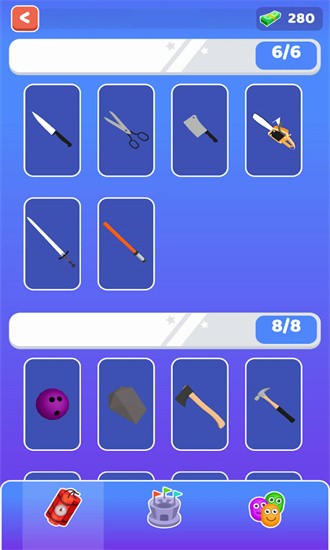 谁先阵亡免广告版是一款策略与操作相结合的动作游戏,玩家必须通过挑选和投掷武器来战胜对手。游戏以其简易的操作方式和多样的武器选项,为玩家带来了既紧张刺激又能够释放压力的游戏体验。无论是独自挑战还是与朋友进行对战,谁先被淘汰都能引发无尽的欢乐,在攻击的过程中,不同的工具将会有不同的作用,玩家需要善于利用这些工具,以确保自己能够在一个较短的时间内顺利的完成自己的攻击任务。