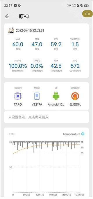 7、MAX最大帧率、MIN最小帧率、AVG FPS平均帧率、VARIANCE帧速率差、≥45FPS流畅度、>46℃烫手警告、MAX最高温度和AVG平均温度等都可以查看,此外还更直观的帧率曲线,以及CPU占用率等曲线等