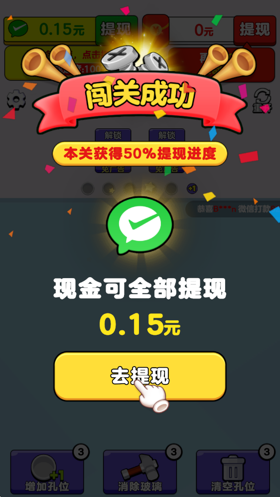 3、游戏中,玩家有机会赢取红包奖励,随着完成关卡的增多,奖励也会愈发丰厚,带给玩家无限欢乐的同时,激发不断前进的动力。
