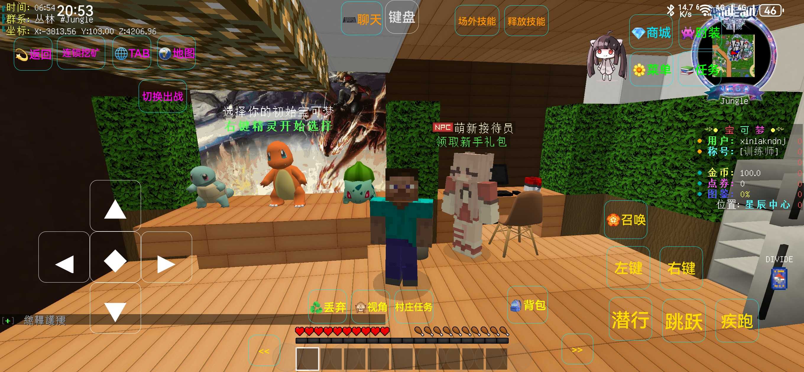 游戏的玩法和原版相同,玩家可以自由的在沙盒世界中冒险,还可以捕捉宝可梦,让他们升级变得更加强大,玩家不仅仅要生存,还需要培育你的宝可梦,玩法更加的有趣。