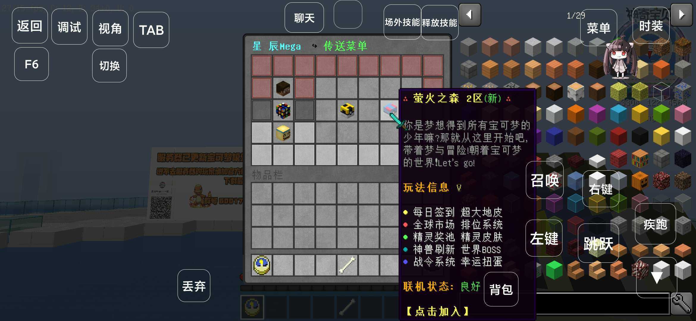 【我的世界宝可梦星辰Mega模组】这是一款沙盒冒险类型的游戏,这款游戏将我的世界和宝可梦结合起来,并且还加入了XY的mega进化石,让宝可梦可以进行超进化。玩家在世界中的不同地形都会遇见不同的宝可梦,比如夜晚出现的幽灵系,在雪山出现的冰系,在荒漠出现的地面和岩石系等等,让玩家在沙盒世界中体验收服宝可梦的魅力,并且还原了原作的回合制战斗等等。