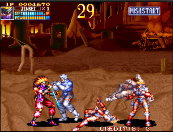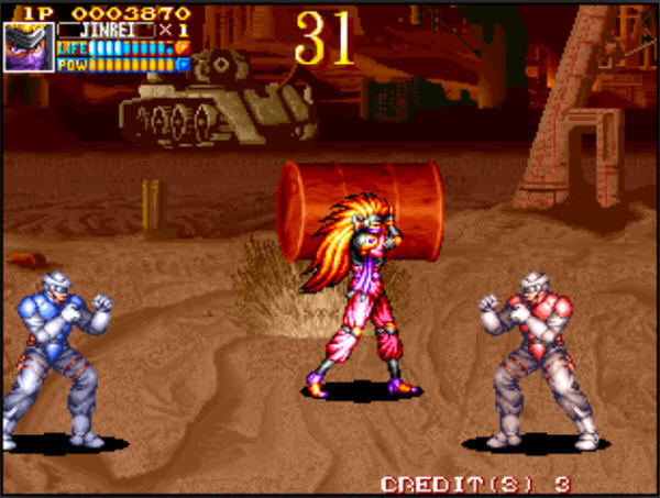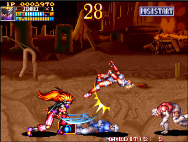 超必杀技: 气满, →→按住 A (一直不放且击中敌), ←→ (红莲乱舞——一旦被打中绝无活命的机会,连打中易被其它敌人攻击)