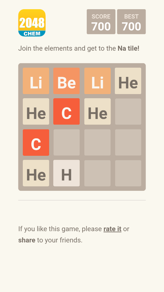 【2048元素版】这是一款休闲益智类型的游戏,游戏的玩法和经典2048相同,但将上面的数字都变成了滑雪元素周期表,将相同的滑雪元素合成即可变成另一个元素,在玩游戏的同时,你还可以了解更多关于化学的知识。以元素周期表为基本元素,玩家可以通过解谜获得2048。这一次,玩家将观察元素的反应,以提高他们的分数,并变得更具挑战性。喜欢这个游戏的人一定不要错过。