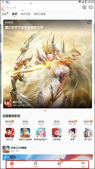 1、下载安装好九游app后即可打开,进入主界面可看到主要划分为首页、找游戏、广场、我的这四大模块;