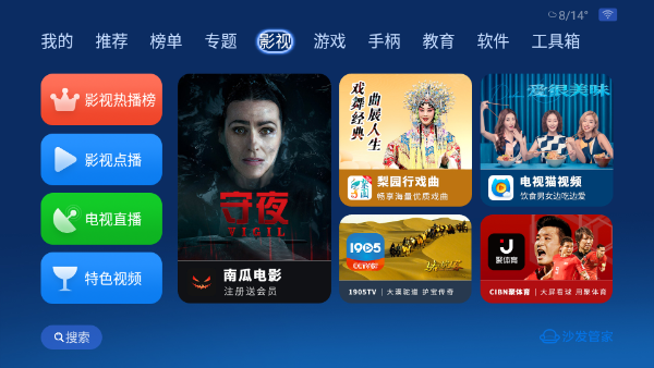沙发管家电视版是一款高质量的应用下载工具。无论是下载应用,还是管理类电视都可以轻松实现。软件为电视盒子提供超多款安全放心的,完美适合在电视盒子上使用的影视,软件,游戏, 中文,英文一应俱全。