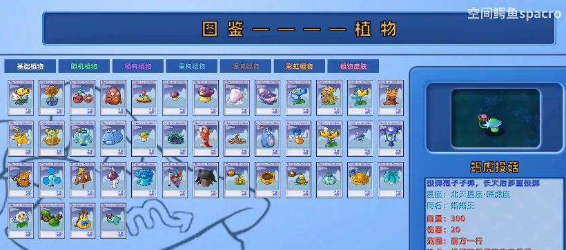 空间鳄梨:稀有植物(场上每有一颗同种植物种植花费提高100),水生兼陆生,当僵尸靠近时会发动一次冲锋,对接触的所有僵尸造成300点伤害;当种植在陆地及种植在莲叶上时,随机发射三连星星类子弹(星星子弹、冰星子弹、火星子弹、雷星子弹)