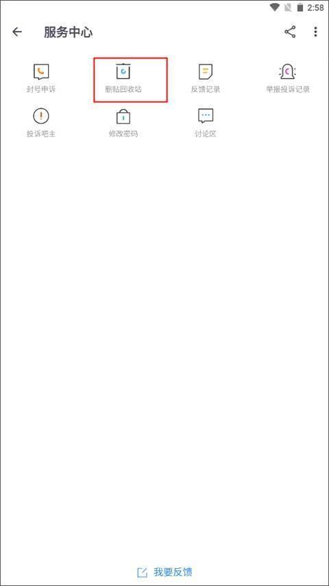 2、这里包含封号申诉、删帖回收站、反馈记录等功能,点击删帖回收站。