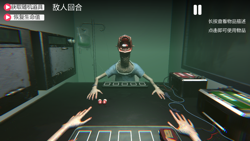 【毒药试吃员(药丸轮盘赌)游戏】这是一款回合制类型的游戏,游戏由“DarkPlay Game”工作室出品,玩家为了能离开医院,需要跟一个大嘴怪挑战最终的胜利者,玩家每一局都需要吃一颗药丸,并保证药丸是无毒的,最后消耗掉敌人所有的生命值,才能获得游戏最终的胜利。游戏中有很多道具可以让你反败为胜,比如确定有毒的药丸、用薄荷糖替代等等,让游戏更加刺激。