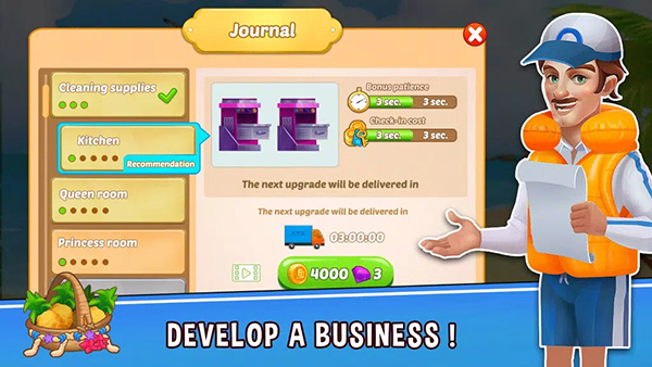 升级酒店房间,提升客户体验,吸引更多高端客户,运用时间管理技巧取悦客人,完成每日任务以获得新的奖励和额外的金钱。