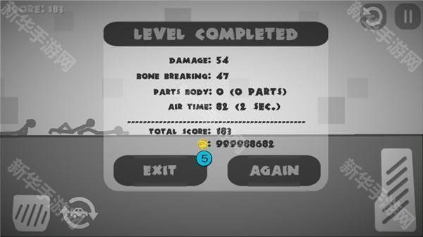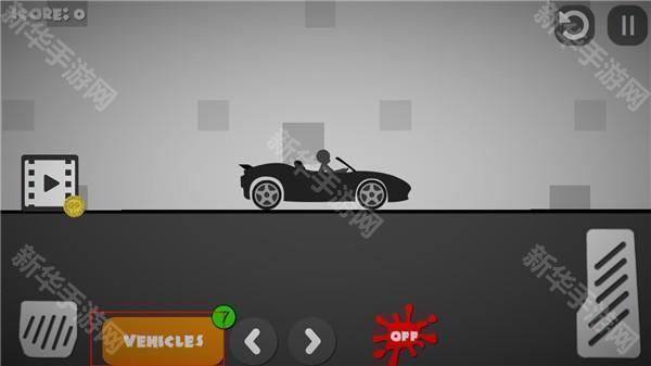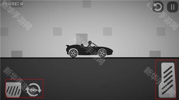 3、活用按钮,左边的按钮是让车减速或者后退的,右边长条的按钮是加速前进的,而有汽车标志的是让车重新从空中落下的,反复使用这三个按钮可以让火柴人受伤更多: