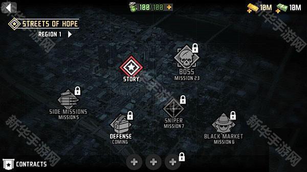 1、下载进入最后的希望3游戏,右侧的红色按钮是任务提示,右上角是金币和钞票显示。