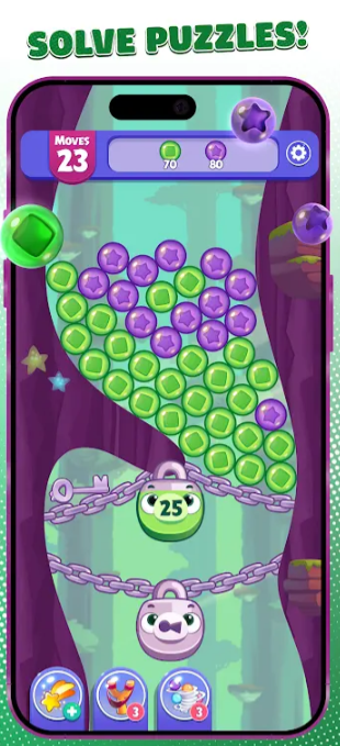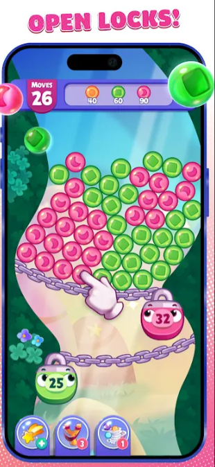 2、享受不可抗拒的淘汰体验,为您带来更多乐趣,挥动手指清除所有气泡,每日登录允许玩家收到为他们准备的礼物。