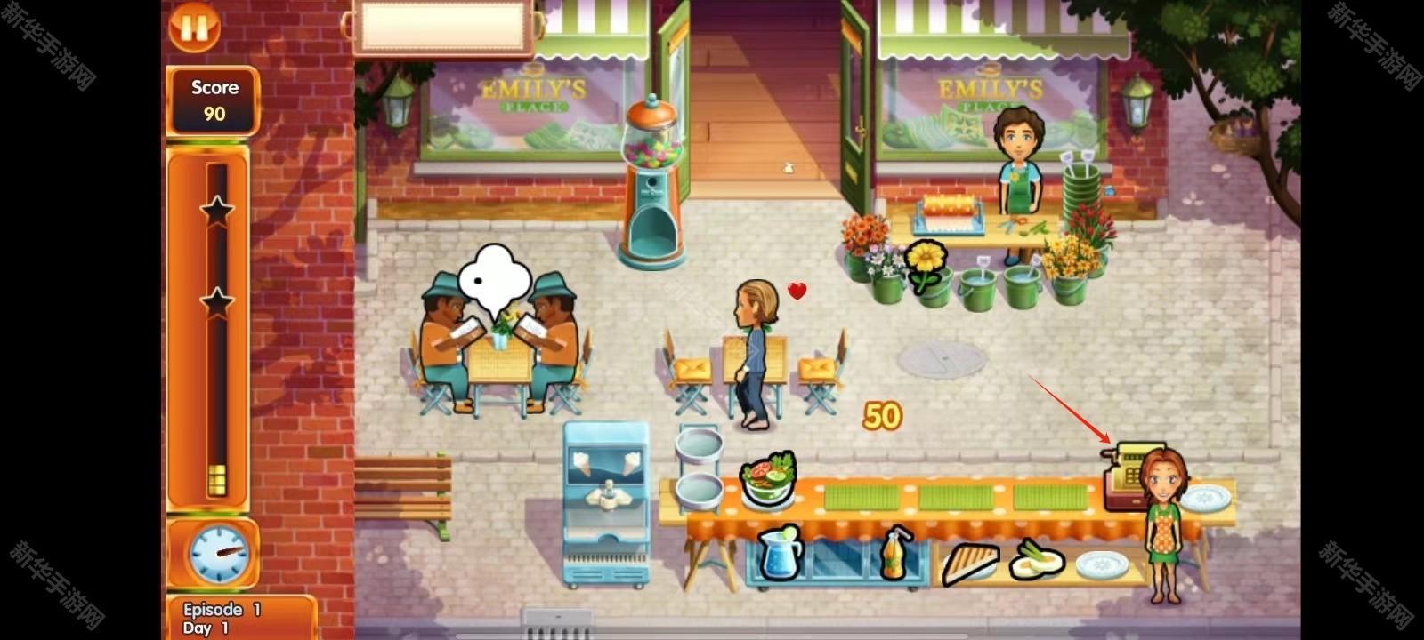 4、之后顾客的头顶上要是出现金币,就要点击收银机进行结账,在规定的时间内完成就可以收获顾客的好感度;