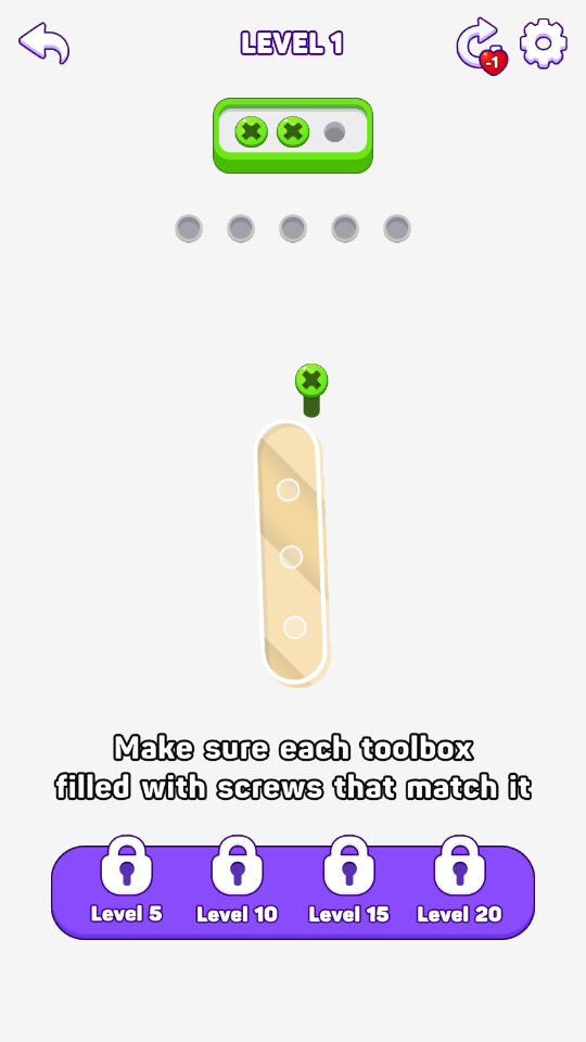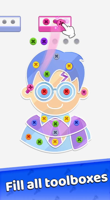1、玩家需要通过点击或滑动的方式拧下玩具上的螺丝,然后根据螺丝的颜色将其拖拽到对应颜色的收纳盒中,完成消除;
