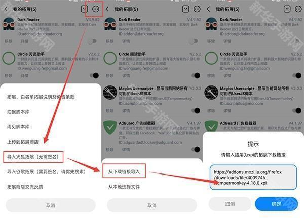 1、安装一个脚本管理器,然后在我的拓展页面点击右上角三横点,再点击导入火狐拓展,再点击从下载链接导入,输入下载连接后点击右下角的确定即可