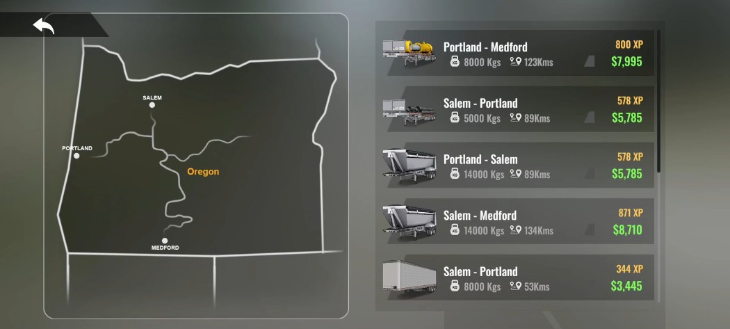 3、使用单挂车、双挂车或三挂车运输货物,选择不同的运输路线,包括城市道路、山路和大型桥梁,完成任务赚取收入。